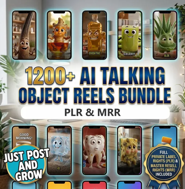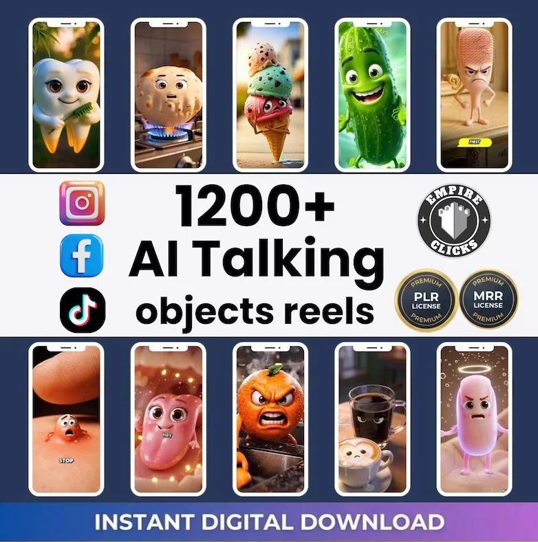 1200+ AI-видео с говорящими предметами | Вирусный набор рилов PLR MRR | Пакет безликого контента для TikTok, Instagram Reels и YouTube Shorts
