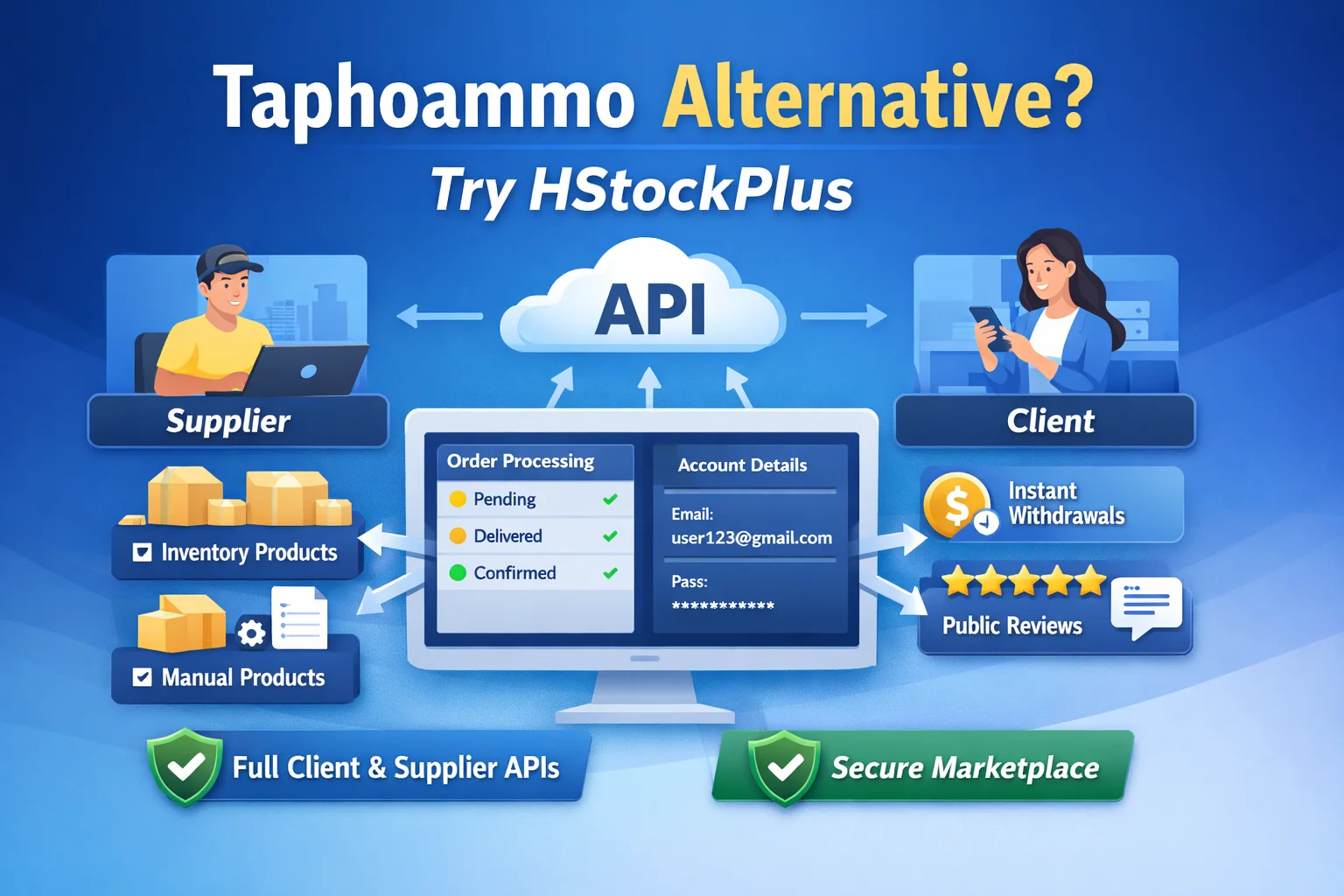 AccsMarket popularized digital account marketplaces, but many buyers and suppliers now face slow payouts, limited transparency, and weak dispute handling. HStockPlus was built as a fair, modern alternative — offering buyer confirmation, full client & supplier APIs, fast withdrawals, and support for both inventory and manual products.
